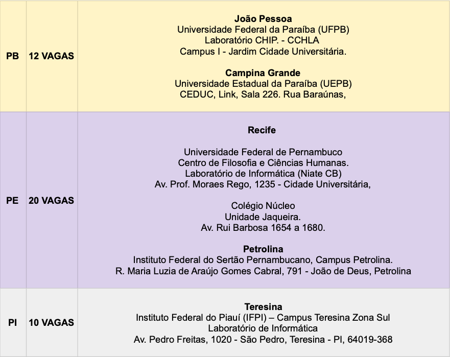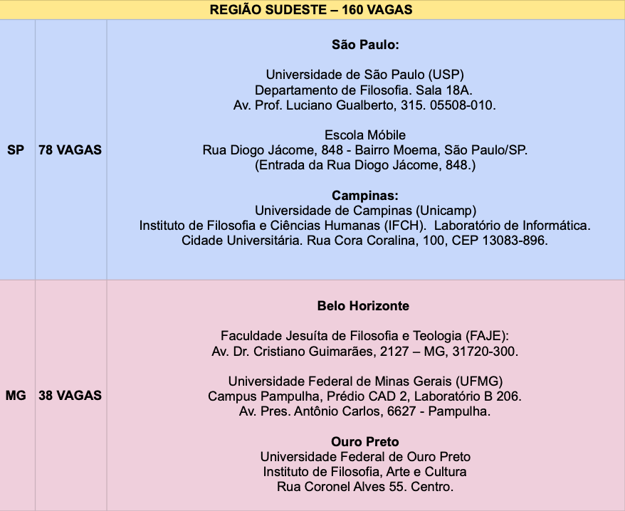 A presente seção apresenta todos os locais previstos para a aplicação da prova que comporá a Etapa Regional da II Onfil. Por motivos de força maior, qualquer um desses locais poderá vir a ser substituído por outro local próximo, e qualquer mudança será comunicada por e-mail e no site da Onfil. Para informações sobre os critérios que definem a distribuição de vagas entre regiões e estados, conferir a seção 2 (“Inscrições”) acima.
